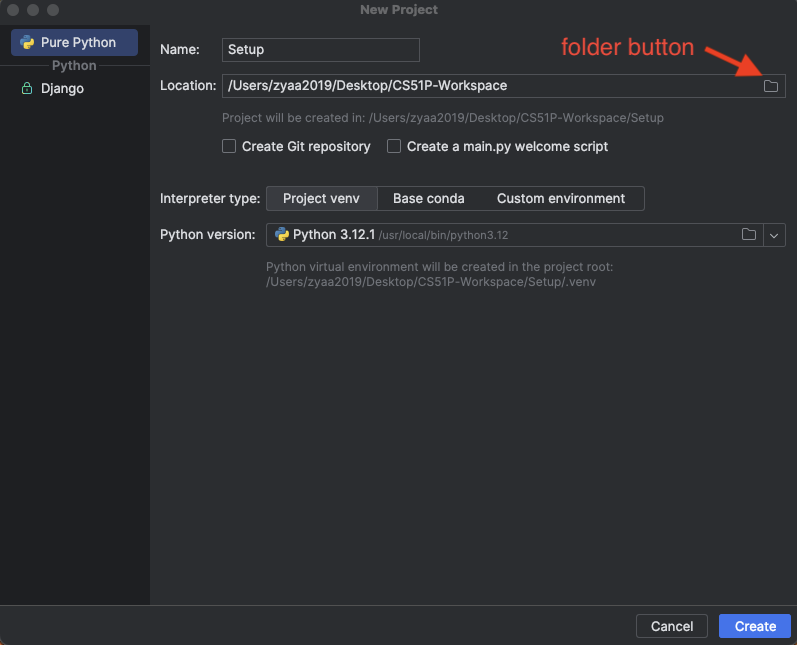 CSCI51p-Workspace you just created on your Desktop. CSCI51p-Workspace to open. After that, in the Location bar, you need to manually type in the subfolder name /Setup to create this new subfolder. Your configuration window should like similar to this: